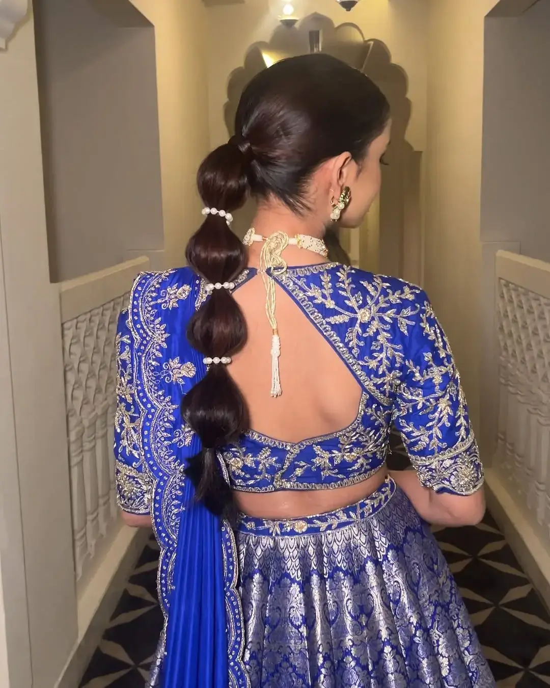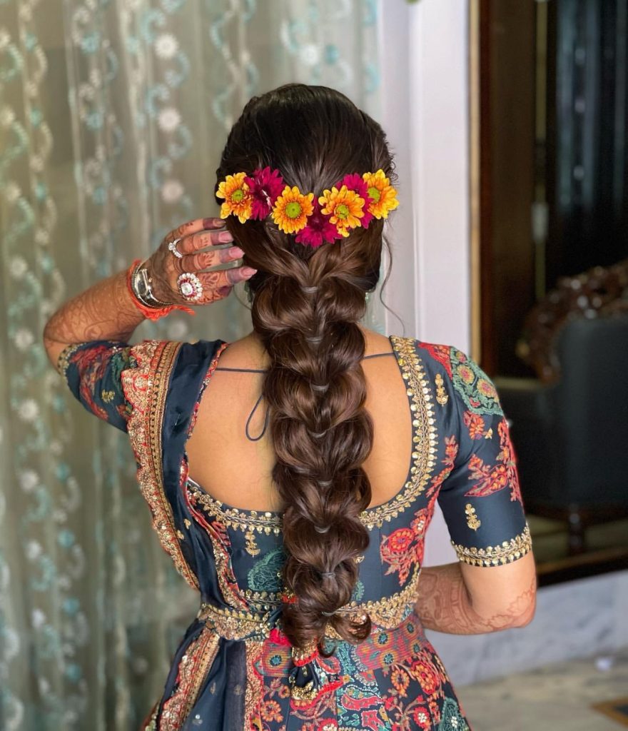 This trending hairstyle adds a playful and stylish touch to your Sangeet look. The bubble ponytail stands out in photos and pairs well with Indo-western silhouettes.