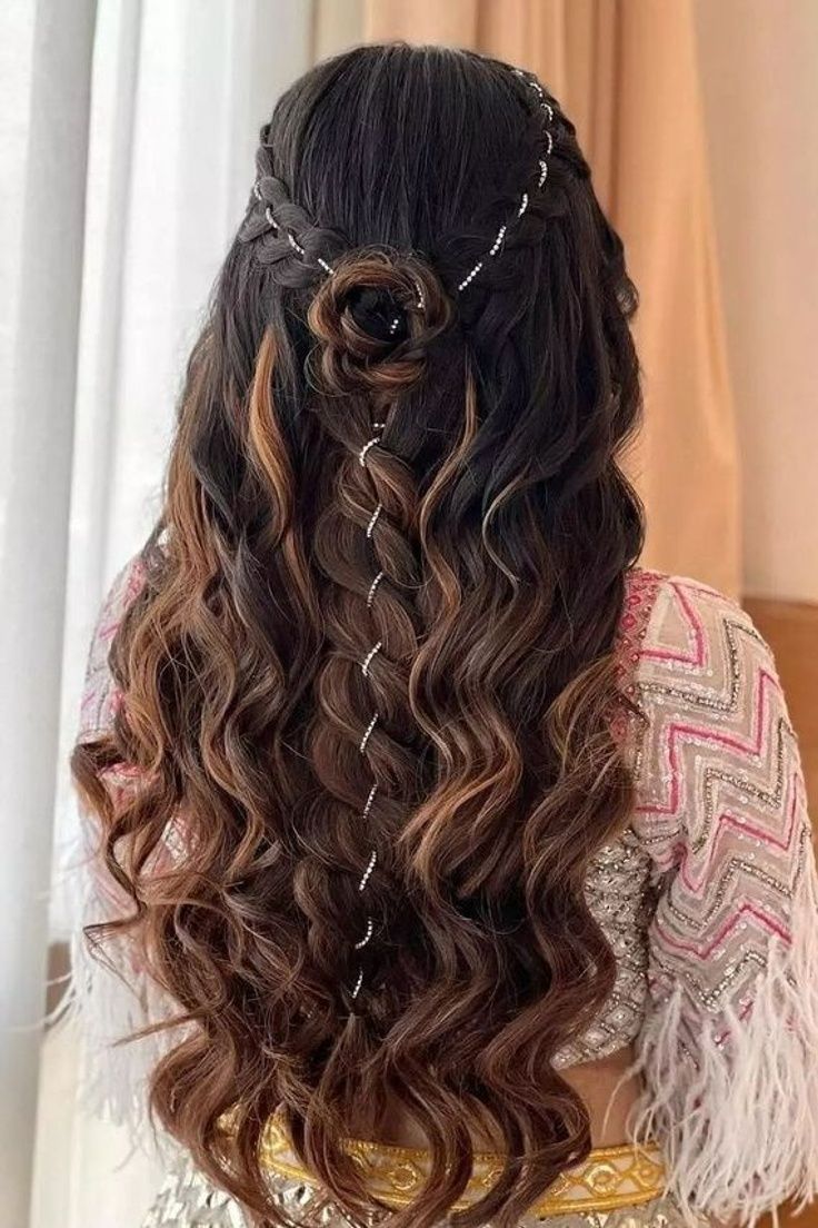 This hairstyle is the best of both worlds, open hair for softness, and half-tied for structure. It adds height, volume, and perfectly complements heavily embroidered outfits.