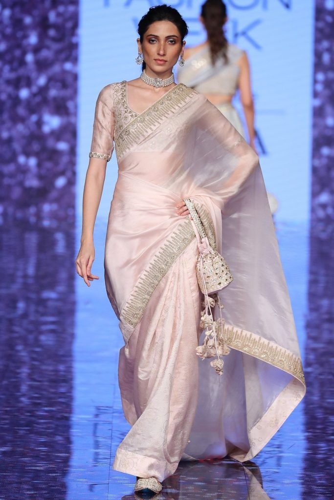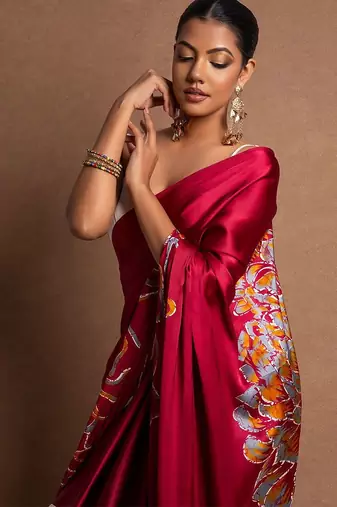 Colours like champagne gold, deep wine, emerald green, navy blue, and rose gold are especially popular. Satin sarees pair best with structured blouses like corset-style blouses, sleeveless cuts, or sweetheart necklines. Keep your jewellery minimal and let the saree do the talking.